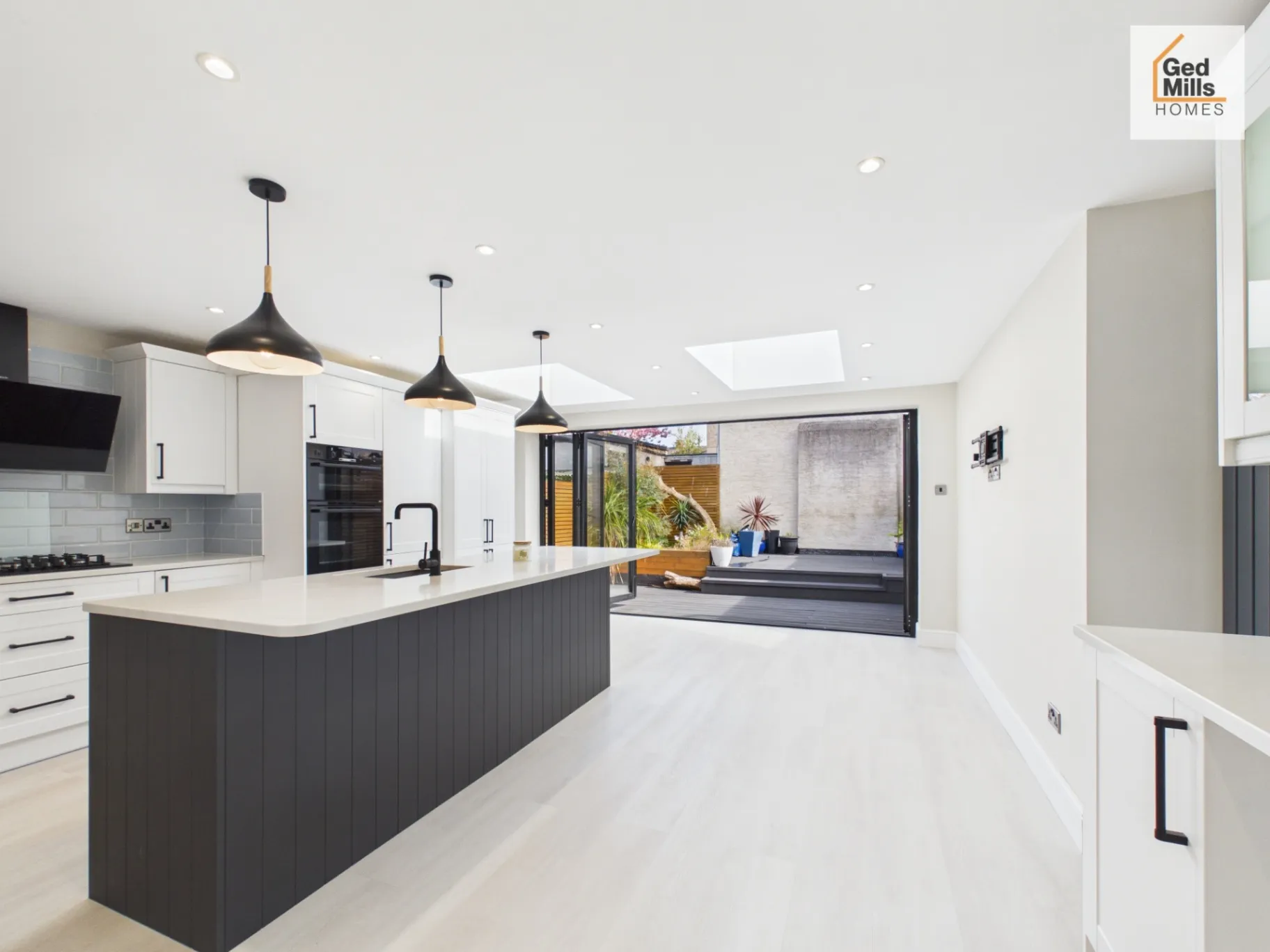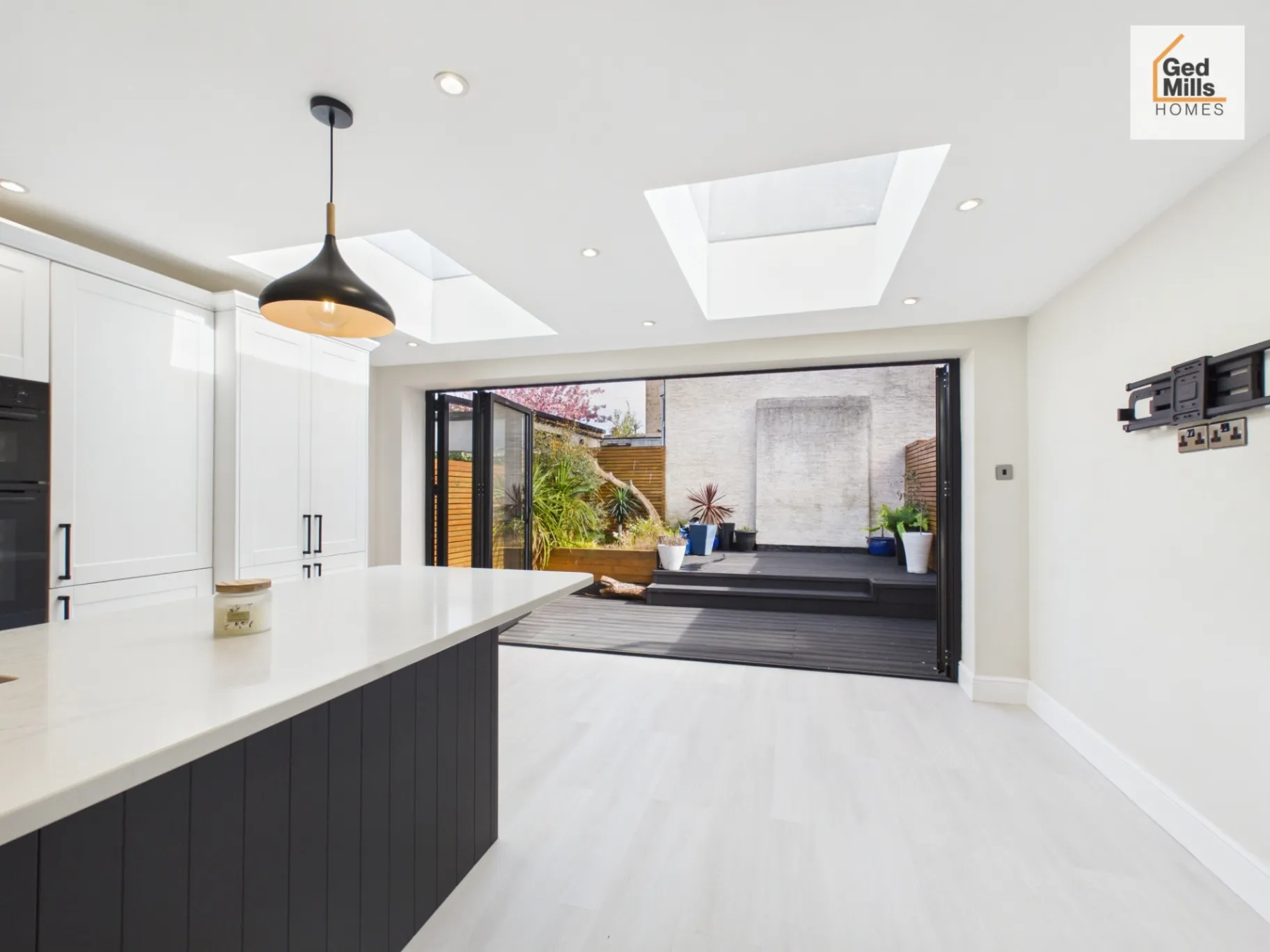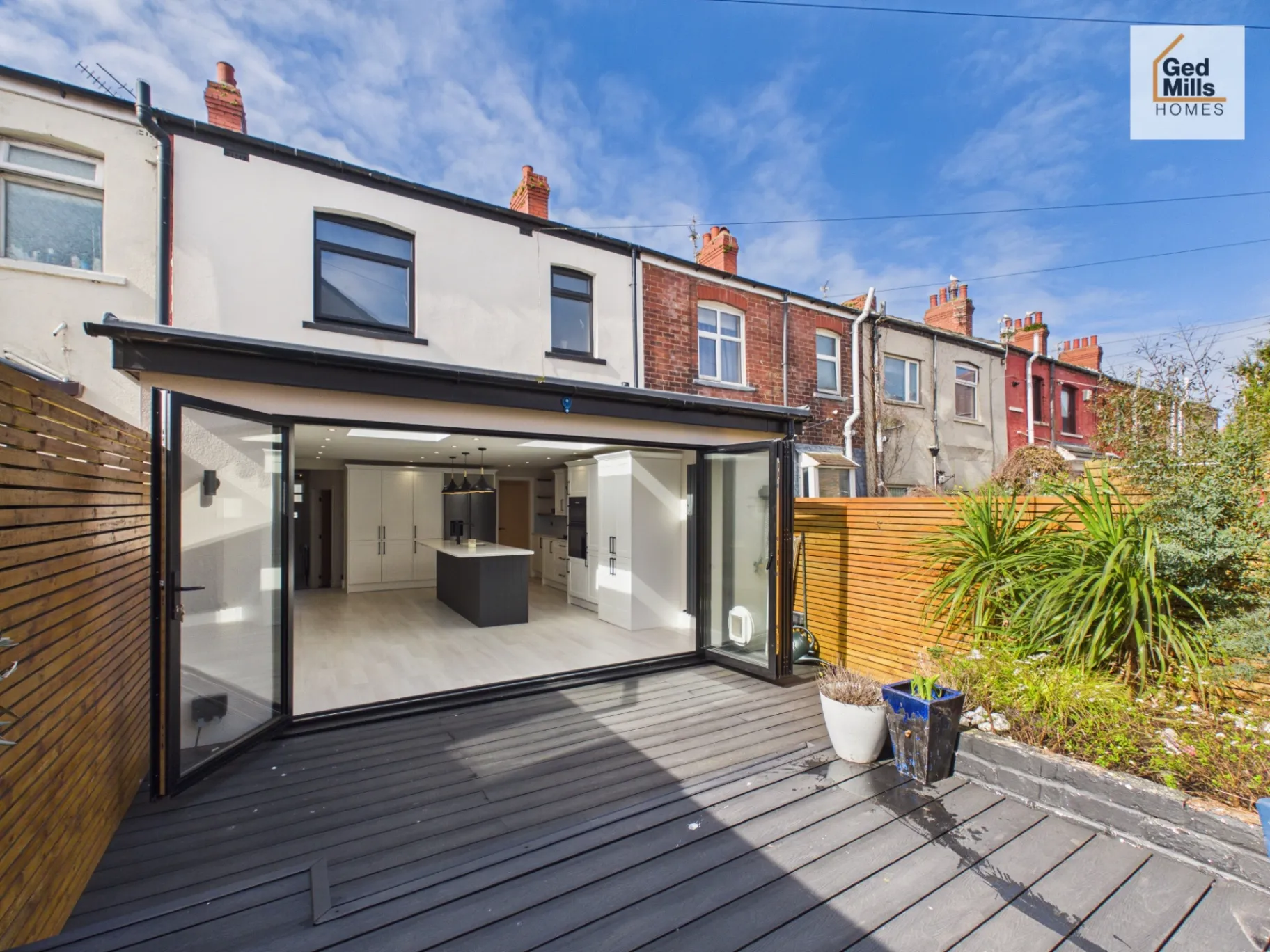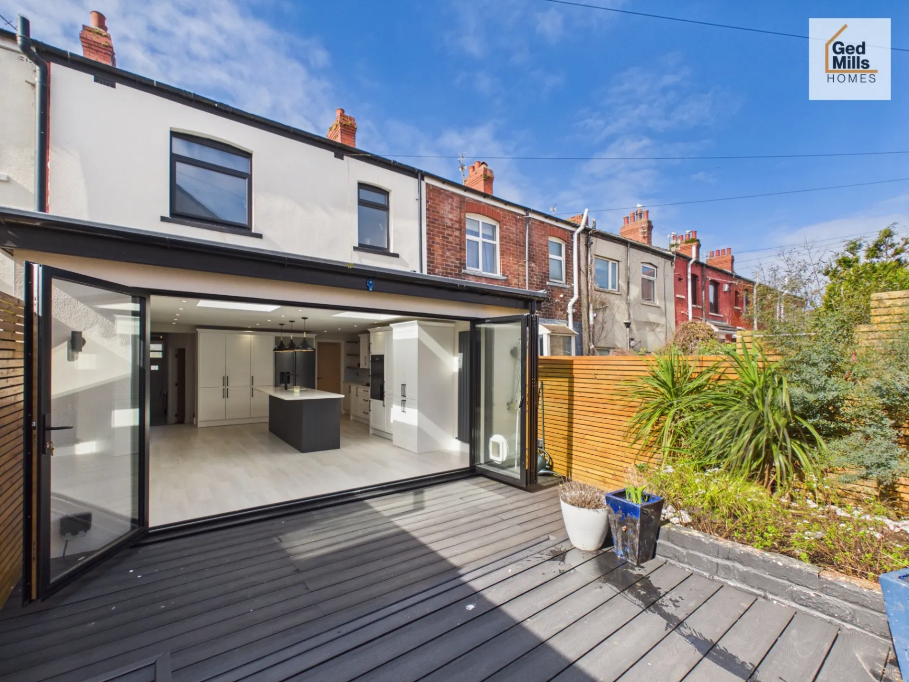 Bi-fold doors leading to a decked rear garden
